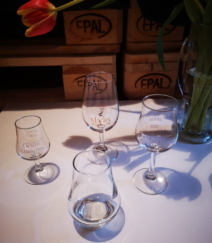 La degustación del whisky no consiste solamente en identificar el sabor particular que tiene cada uno, sino también identificar aromas, olores, así como el sabor en el paladar y el sabor en la boca. Para sacar el mayor provecho cuando se está degustando un single malt whisky, es recomendable, por lo tanto, contar con una copa o un vaso especial.
